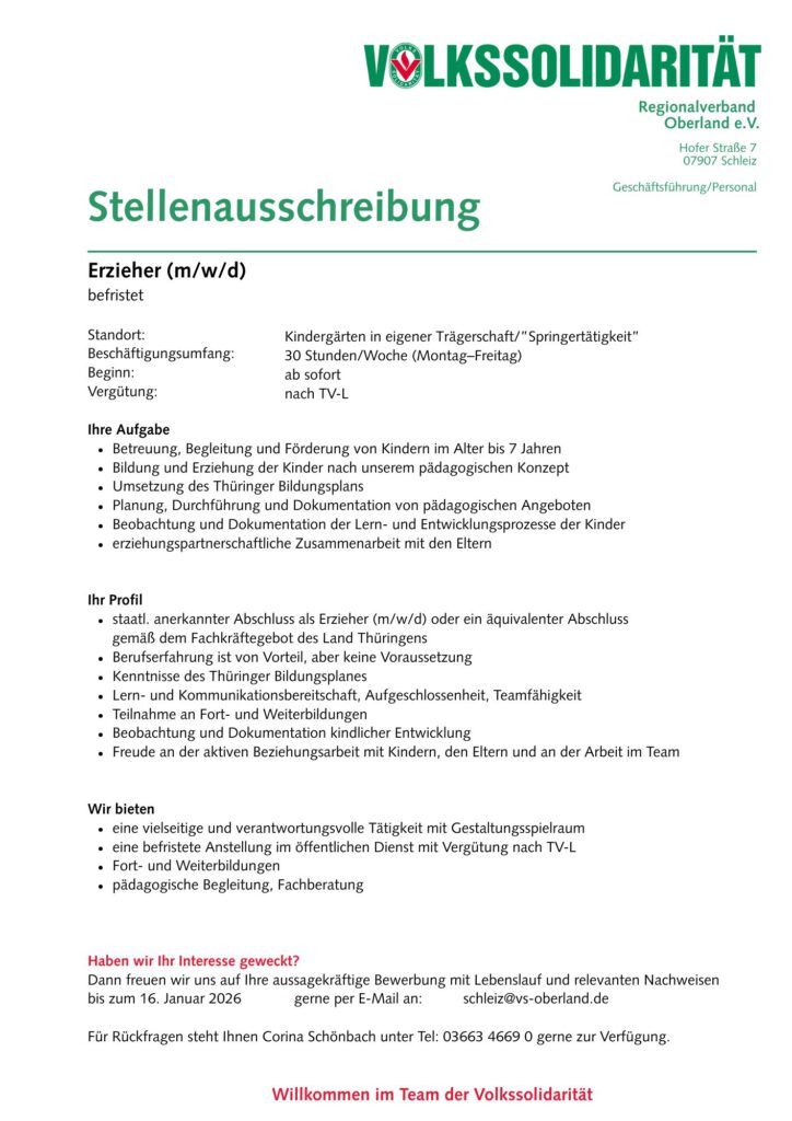 in Trägerschaft der Volkssolidarität Regionalverband Oberland e.V.