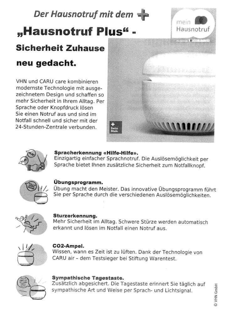 Unsere modernen Hausnotruf-Geräte können einen Notruf per Spracherkennung – Hilfe! Hilfe! – oder per Knopfdruck auslösen. Trägt man den Sender beispielsweise am Armband werden schwere Stürze des Trägers oder der Trägerin erkannt und es wird automatisch ein Notruf ausgelöst. Die integrierte CO2-Ampel zeigt außerdem an, wann es Zeit ist, zu lüften.