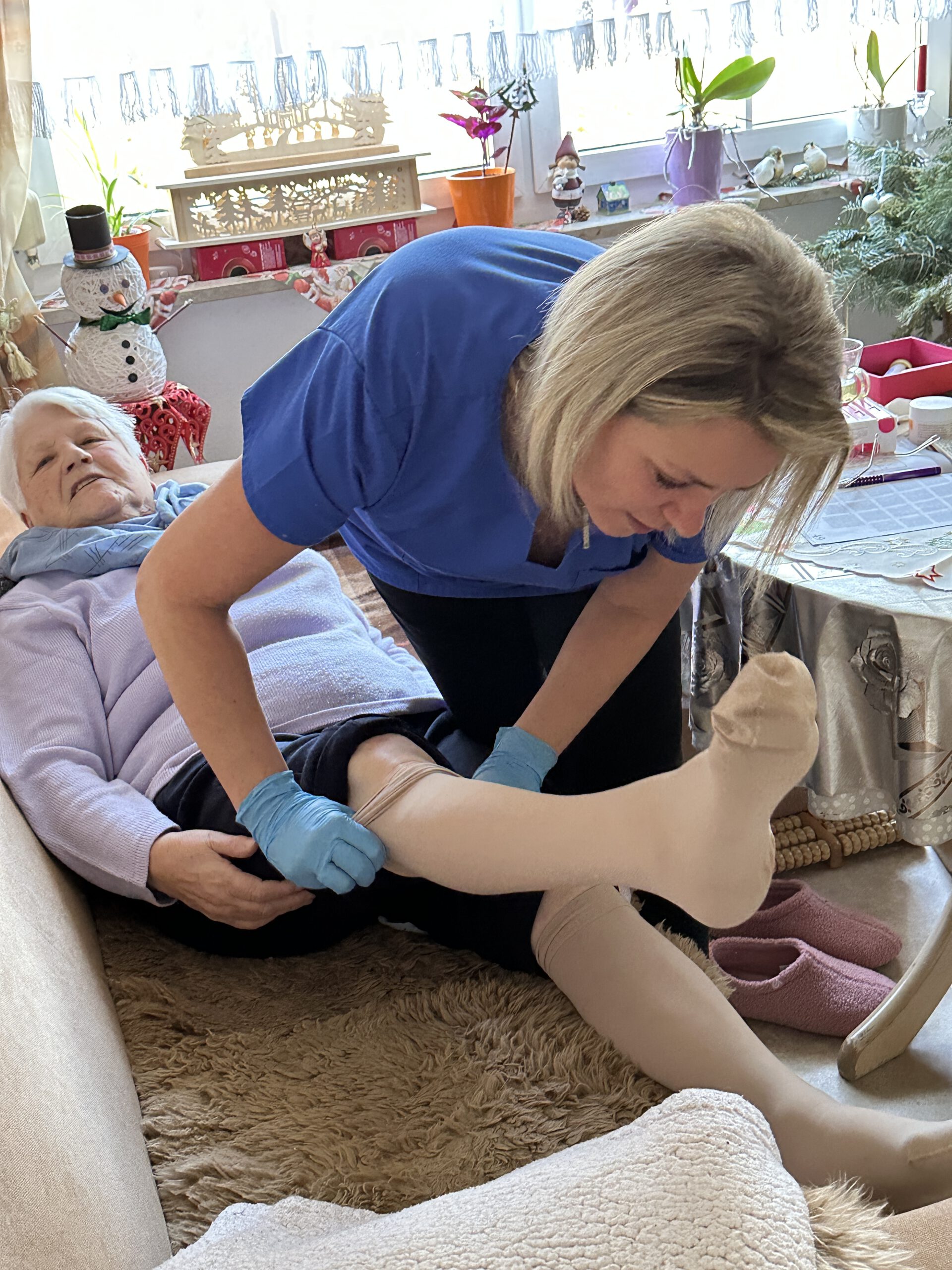 „Hallo Elli“, ruft Frances Müller schon zur nächsten netten Dame ins Wohnzimmer. Elisabeth Harnisch freut sich jedes Mal, wenn die Mitarbeiterinnen des Pflegedienstes kommen. Zum Beispiel das Anziehen der Kompressionsstrümpfe gelingt ihr alleine nicht mehr – sie bekommt Leistungen der Grundpflege. In ihrem Wohnzimmer hat sie immer ihre ganze große Familie bei sich – auf schönen Bildern, die an der Wand über der Couch hängen. Auch von einem Sofakissen lachen ihr die Kinder und Enkelkinder entgegen. „Das ist mir sehr wichtig“, erklärt die Seniorin.
