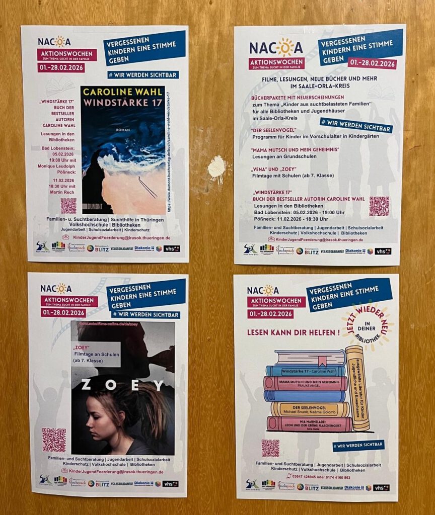 Im gesamten Monat Februar spielen die Aktionswochen in den Jugendhäusern eine wichtige Rolle. Die von der Nakoa-Aktionsgruppe im Saale-Orla-Kreis ausgewählten und bereitgestellten Bücher liegen aus, können gelesen und diskutiert werden. Es gibt mehrere Lesungen in Schulen. Die älteren Schüler bekommen die Aufgabe, zum Thema Sucht in Familien im Internet gemeinsam herauszufinden, welche Hilfsangebote es in der Region gibt.