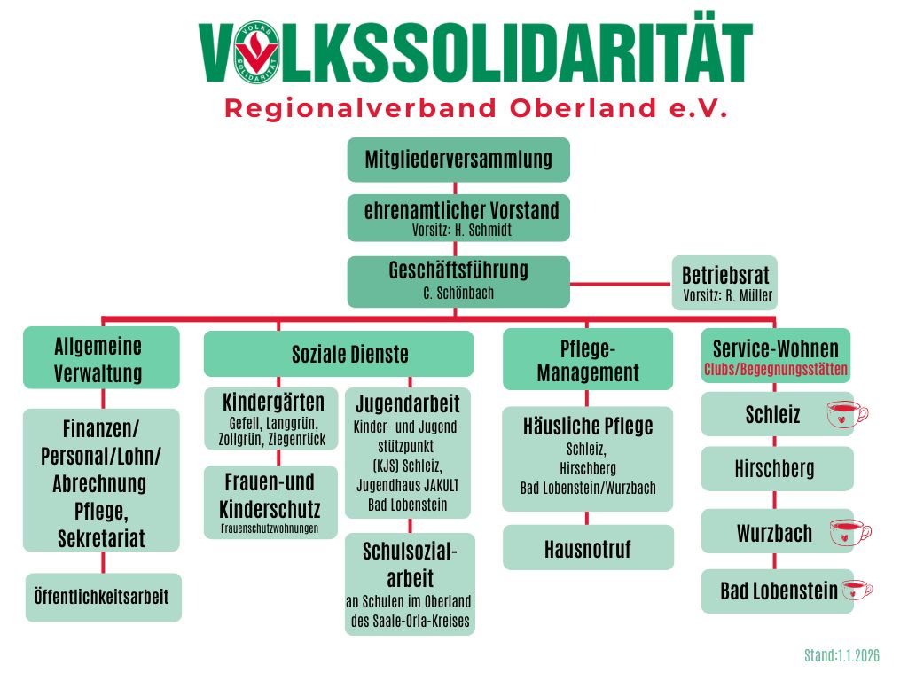 Die Volkssolidarität Regionalverband Oberland e.V. ist eine eigenständige, gemeinnützige Wohlfahrtsorganisation, die parteipolitisch und konfessionell unabhängig ist. Wir stehen für soziale Verantwortung, Teilhabe und ein solidarisches Miteinander im Oberland des Saale-Orla-Kreises. Sei es in der Pflege, Betreuung, Begegnung, in der Kinderbetreuung, Schulsozial- oder Jugendarbeit – unsere Angebote richten sich an Menschen in unterschiedlichen Altersgruppen und Lebenslagen.